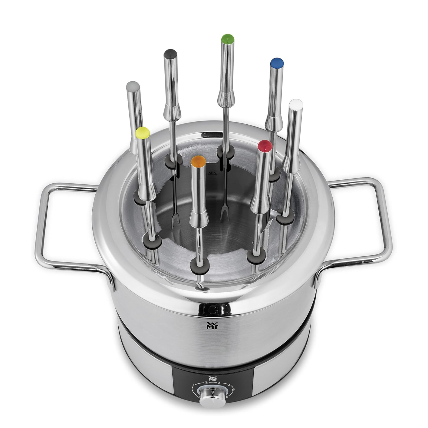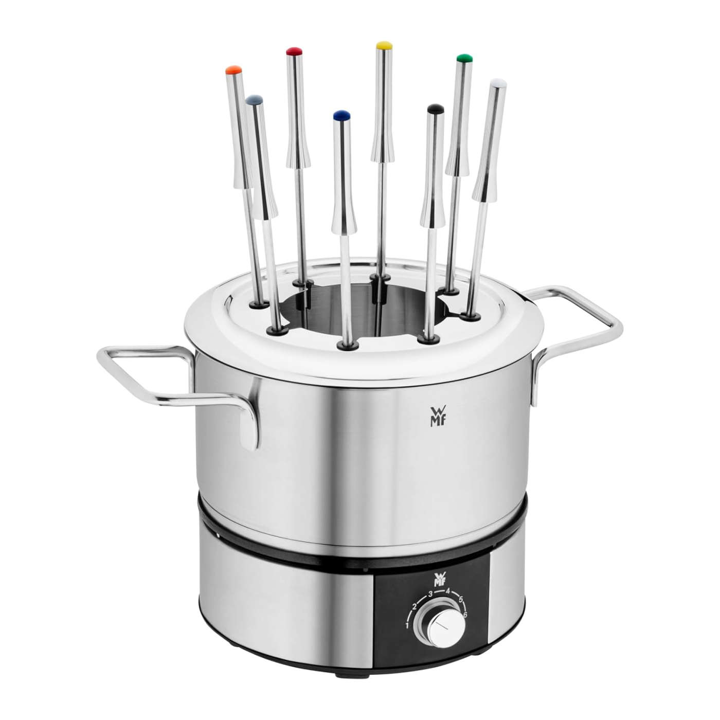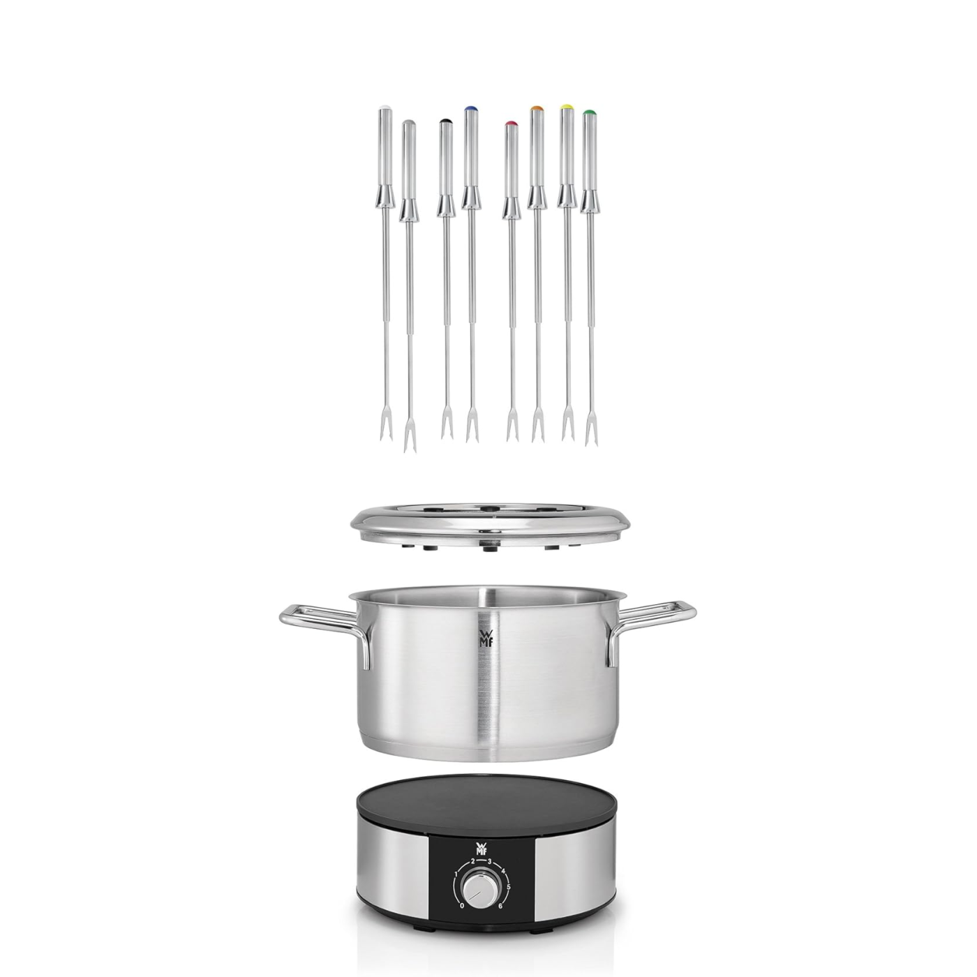 Корпус и чаша выполнены из премиальной нержавеющей стали Cromargan 18/10 с матовой отделкой — материала, известного своей долговечностью, устойчивостью к царапинам и простотой в уходе. В набор входят 8 прочных вилочек из нержавеющей стали с цветной маркировкой, чтобы каждому гостю было удобно узнавать свой прибор.