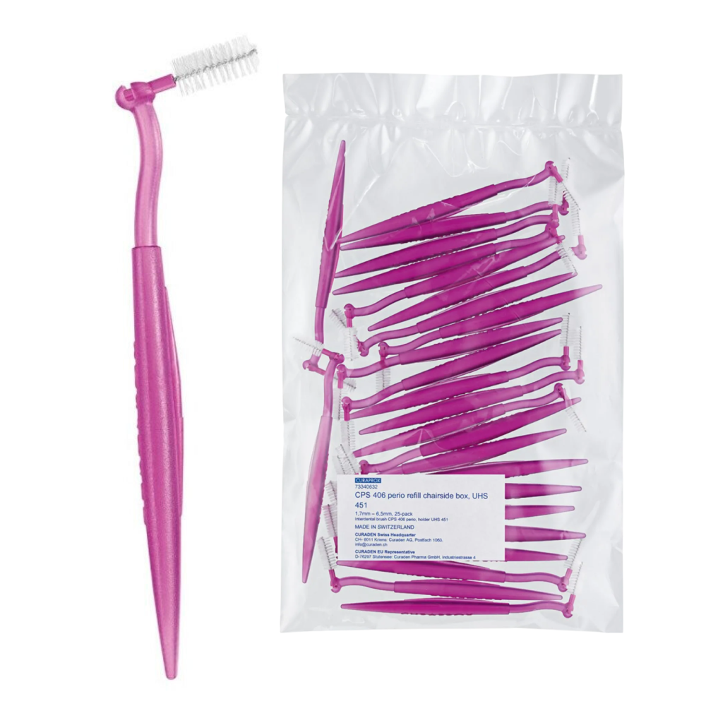 Набор ершиков CURAPROX Perio CPS 406 с держателями предназначен для тщательной и бережной очистки межзубных промежутков, особенно при пародонтите, широких зазорах между зубами или наличии коронок, мостов и имплантов. Обычные тонкие ершики не всегда способны очистить эти участки полностью, поэтому серия CPS Perio имеет более густые и мягкие щетинки, которые легко проникают в пространство между зубами и тщательно удаляют налет и остатки пищи, не травмируя десны.