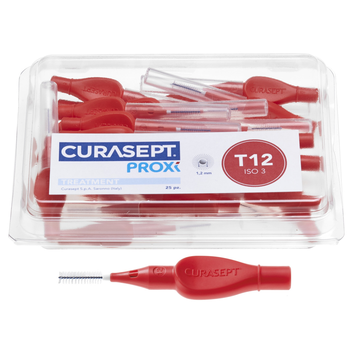 Набор CURASEPT PROXI T12 состоит из 25 ершиков с диаметром стержня 1,2 мм. У каждого ершика есть защитный колпачок, который может использоваться для удлинения ручки.