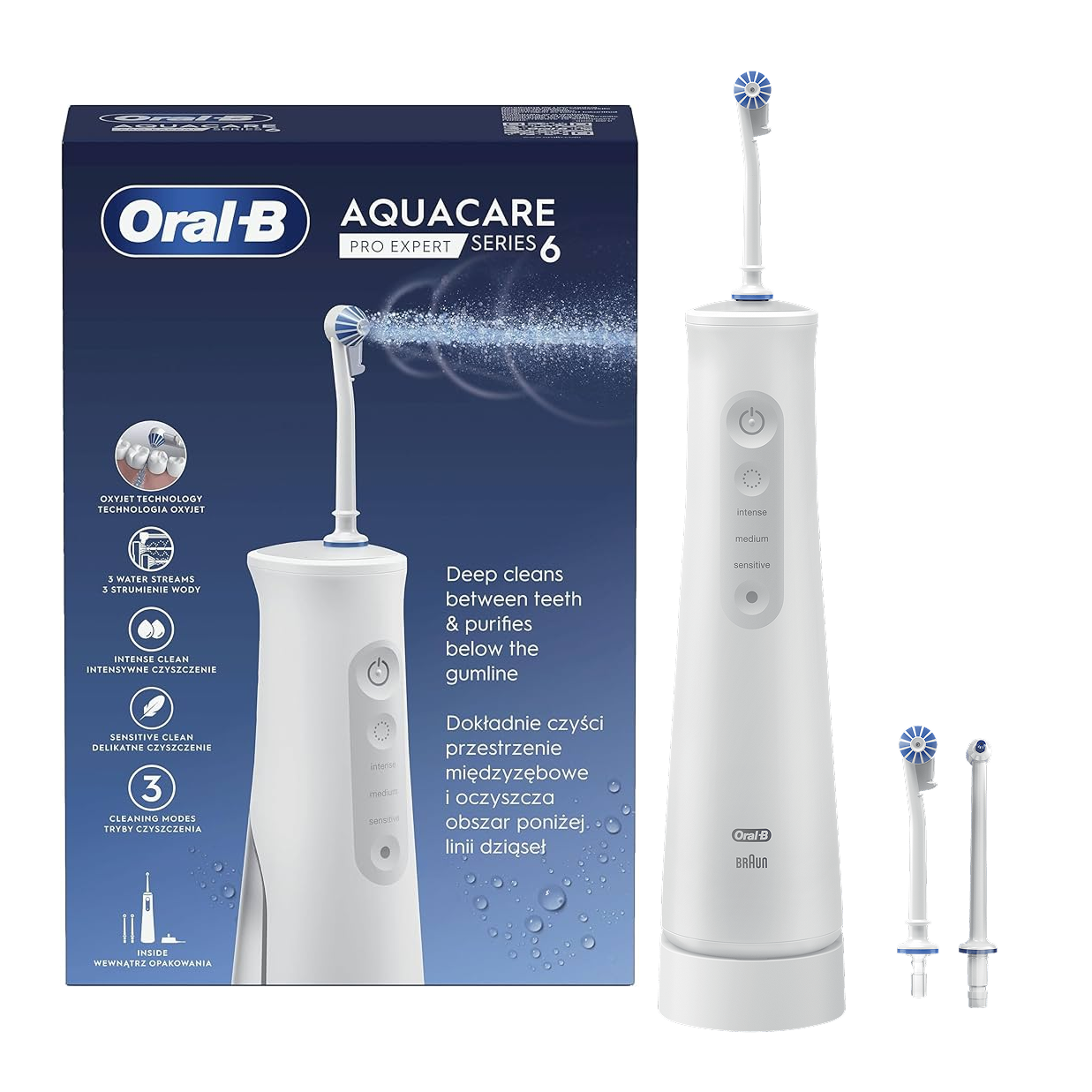 Oral-B Aquacare 6 Pro-Expert подходит для людей с чувствительными зубами и деснами, а также безопасен при наличии брекетов, имплантов, коронок и мостов. Компактный формат делает ирригатор удобным для использования дома и в поездках.