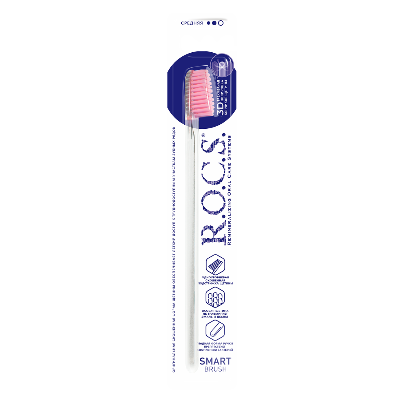 Зубная щетка R.O.C.S. Smart brush классическая средней жесткости обеспечивает эффективный гигиенический уход за полостью рта на каждый день. Текстурированная щетина, скошенная к концу головки щетки, повышает качество чистки поверхности зубов и позволяет с легкостью проникать в труднодоступные участки зубного ряда. Закругленные, отполированные на концах щетинки, не повреждают эмаль и зубные реставрации, не травмируют десны. Тонкая плоская ручка, выполненная из безопасного, нетоксичного пластика, снижает излишнее давление во время чистки и способствует правильной технике.