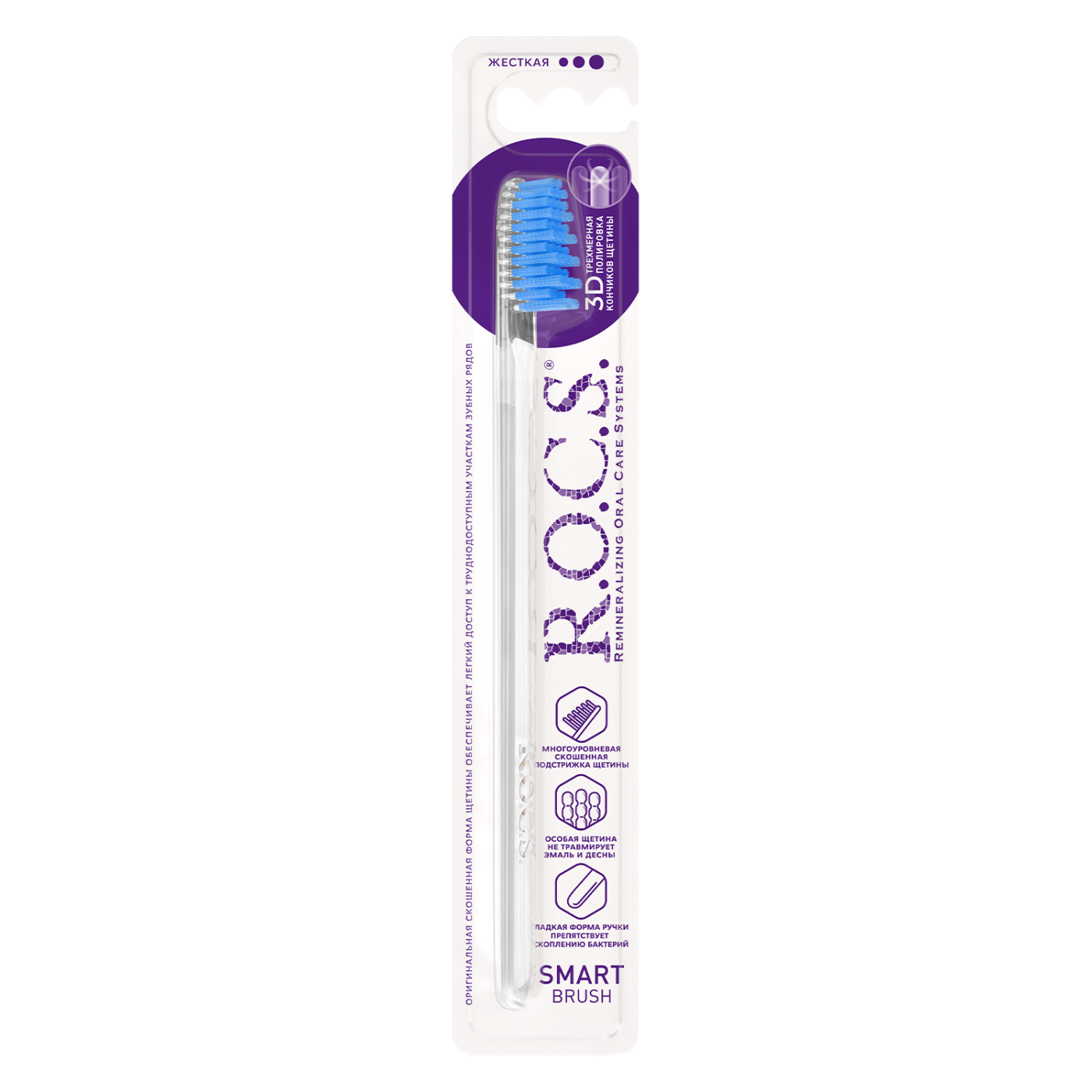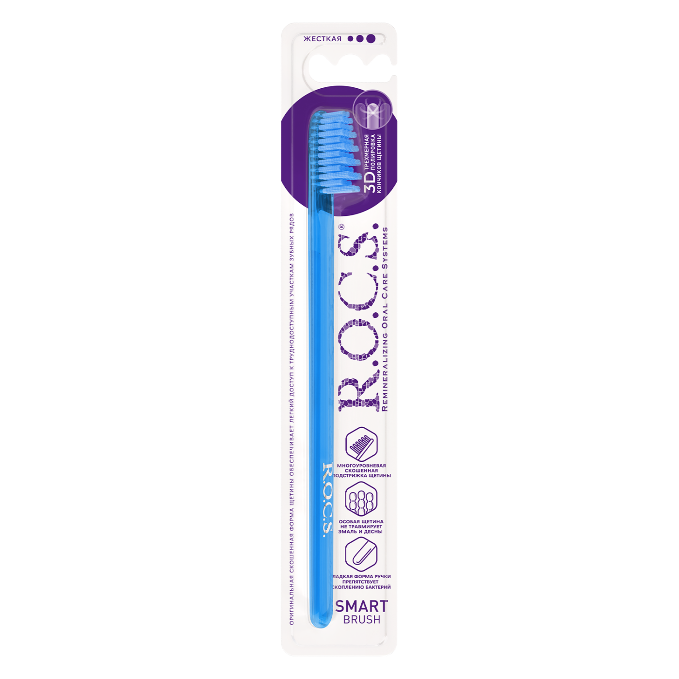 Зубная щетка R.O.C.S. Smart brush модельная с жесткой щетиной обеспечивает эффективный гигиенический уход за полостью рта при усиленном образовании зубного налета. Многоуровневая подстрижка щетины, скошенная к концу головки щетки, повышает качество чистки поверхности зубов и позволяет с легкостью проникать в труднодоступные участки зубного ряда. Закругленные, отполированные на концах щетинки, не повреждают эмаль и зубные реставрации, не травмируют десны. Тонкая плоская ручка, выполненная из безопасного, нетоксичного пластика, снижает излишнее давление во время чистки и способствует правильной технике.