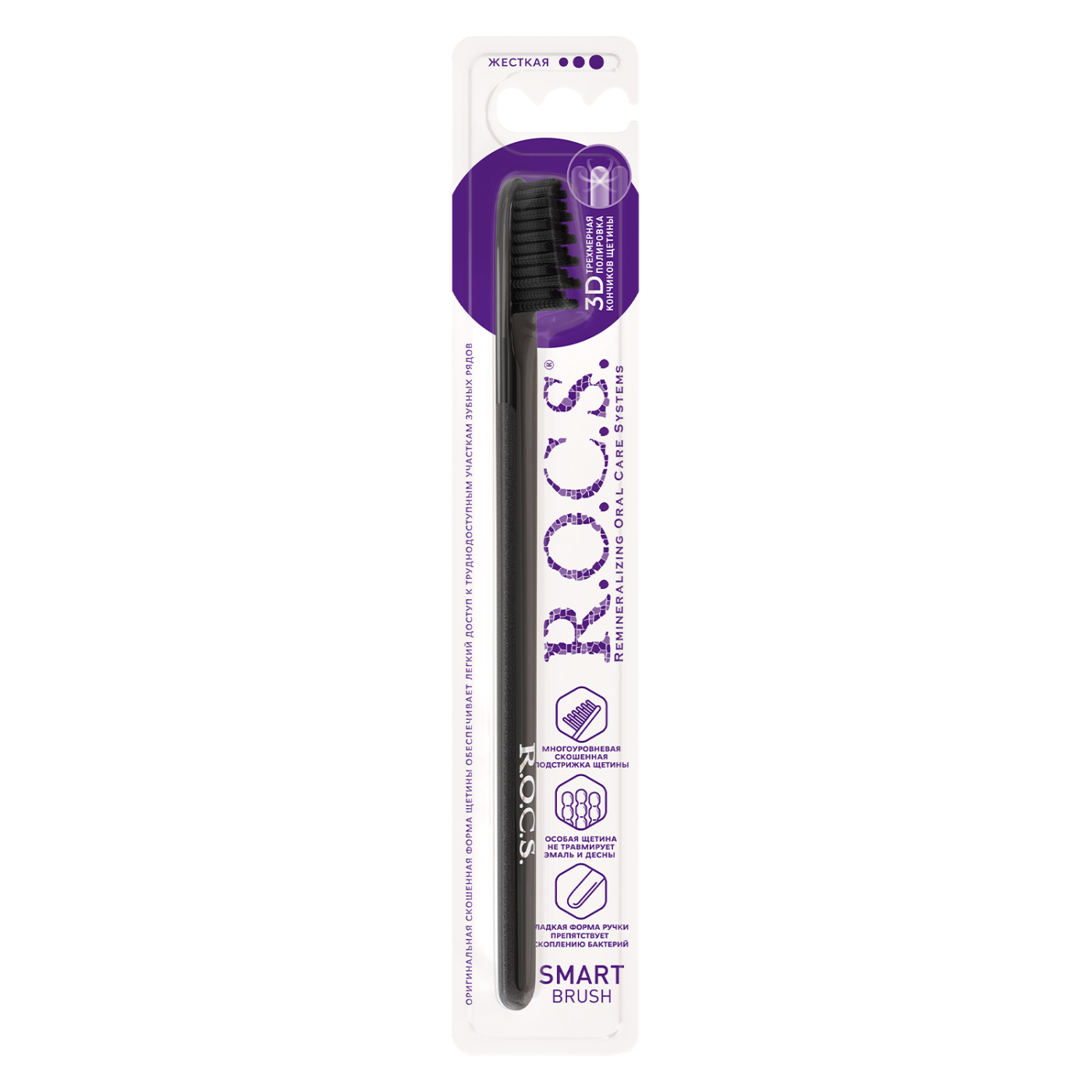 Зубная щетка R.O.C.S. Smart brush модельная с жесткой щетиной обеспечивает эффективный гигиенический уход за полостью рта при усиленном образовании зубного налета. Многоуровневая подстрижка щетины, скошенная к концу головки щетки, повышает качество чистки поверхности зубов и позволяет с легкостью проникать в труднодоступные участки зубного ряда. Закругленные, отполированные на концах щетинки, не повреждают эмаль и зубные реставрации, не травмируют десны. Тонкая плоская ручка, выполненная из безопасного, нетоксичного пластика, снижает излишнее давление во время чистки и способствует правильной технике.