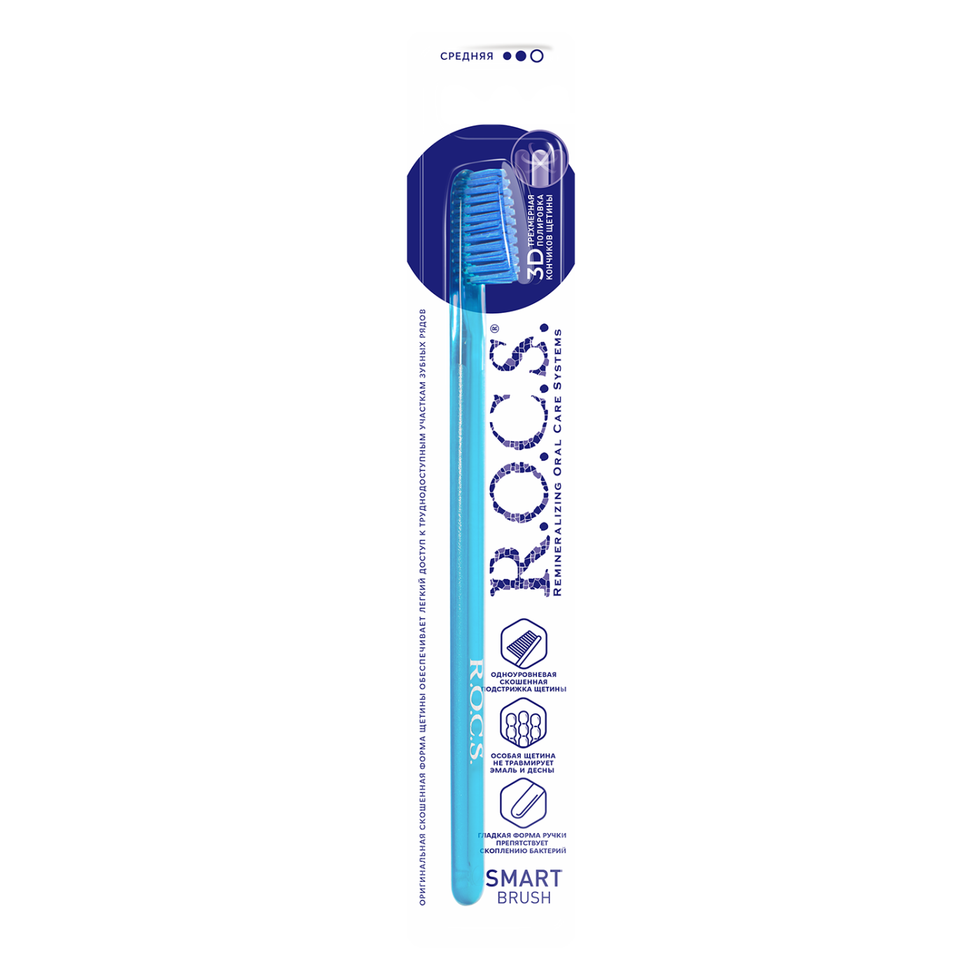 Зубная щетка R.O.C.S. Smart brush классическая средней жесткости обеспечивает эффективный гигиенический уход за полостью рта на каждый день. Текстурированная щетина, скошенная к концу головки щетки, повышает качество чистки поверхности зубов и позволяет с легкостью проникать в труднодоступные участки зубного ряда. Закругленные, отполированные на концах щетинки, не повреждают эмаль и зубные реставрации, не травмируют десны. Тонкая плоская ручка, выполненная из безопасного, нетоксичного пластика, снижает излишнее давление во время чистки и способствует правильной технике.
