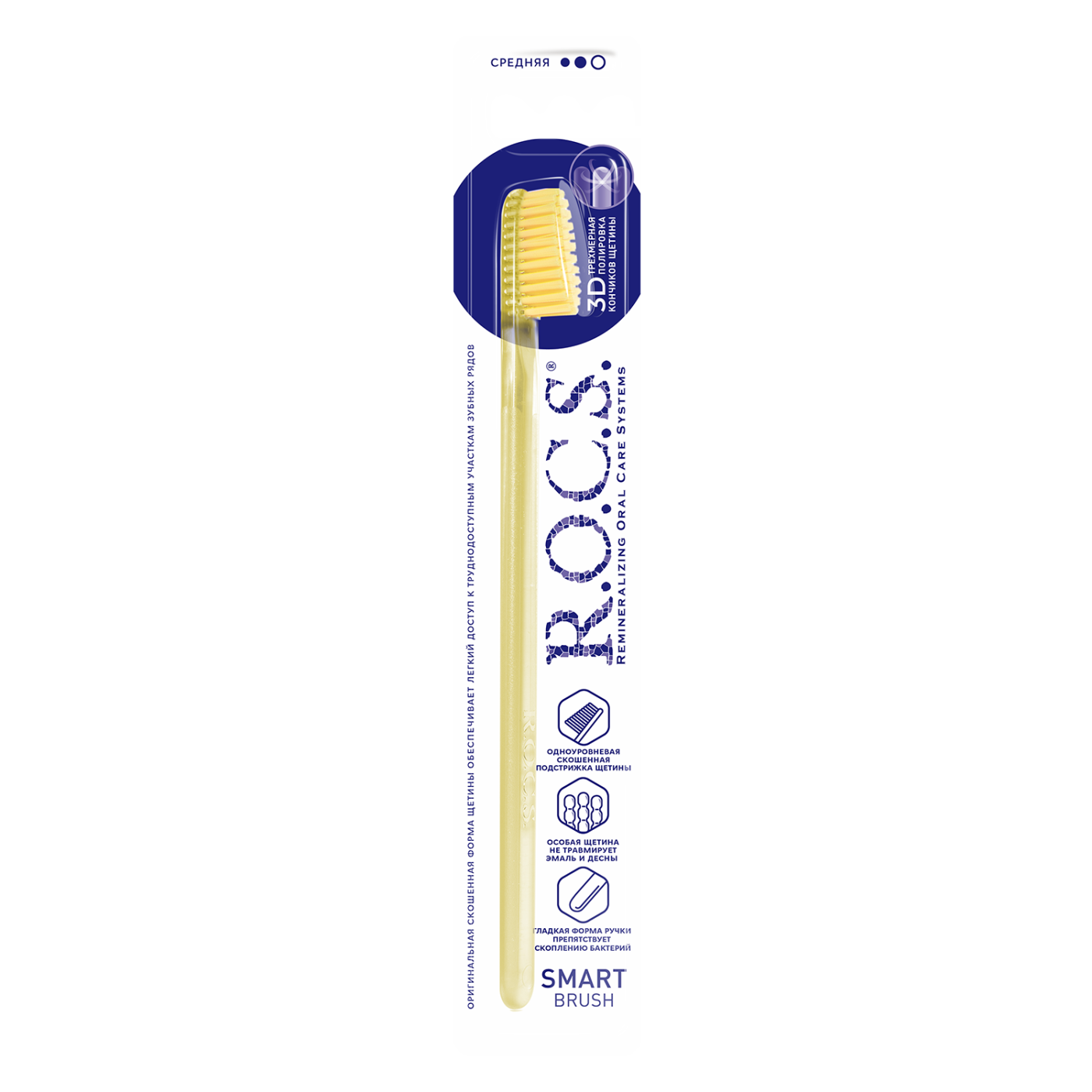Зубная щетка R.O.C.S. Smart brush классическая средней жесткости обеспечивает эффективный гигиенический уход за полостью рта на каждый день. Текстурированная щетина, скошенная к концу головки щетки, повышает качество чистки поверхности зубов и позволяет с легкостью проникать в труднодоступные участки зубного ряда. Закругленные, отполированные на концах щетинки, не повреждают эмаль и зубные реставрации, не травмируют десны. Тонкая плоская ручка, выполненная из безопасного, нетоксичного пластика, снижает излишнее давление во время чистки и способствует правильной технике.