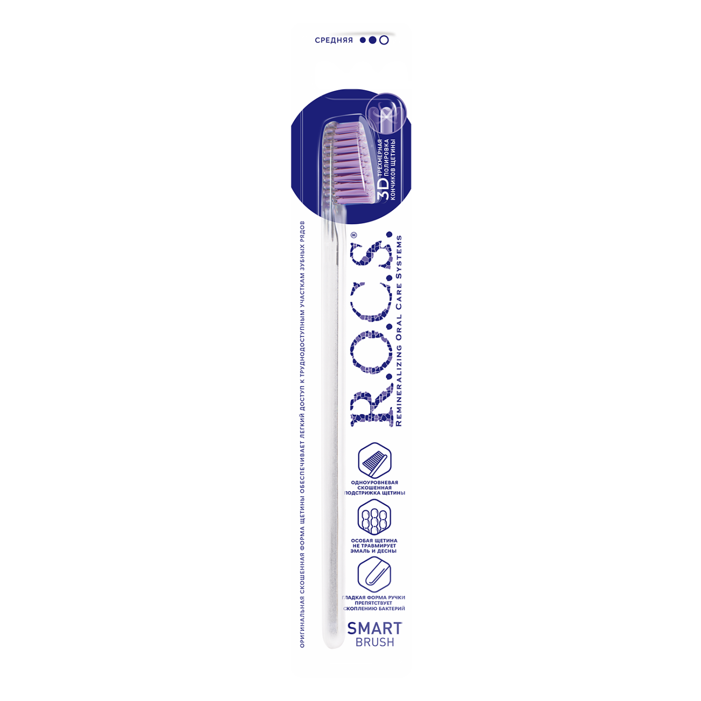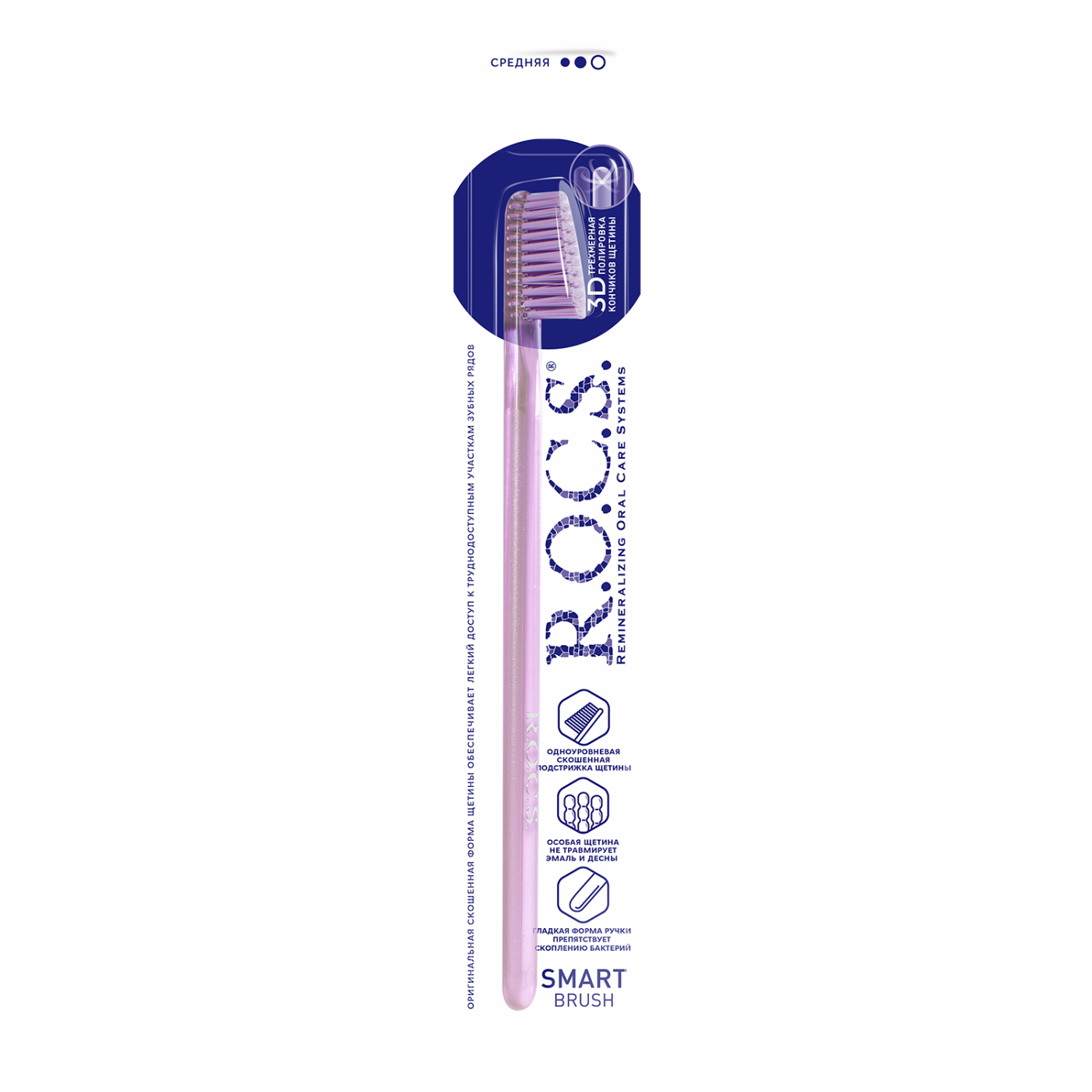Зубная щетка R.O.C.S. Smart brush классическая средней жесткости обеспечивает эффективный гигиенический уход за полостью рта на каждый день. Текстурированная щетина, скошенная к концу головки щетки, повышает качество чистки поверхности зубов и позволяет с легкостью проникать в труднодоступные участки зубного ряда. Закругленные, отполированные на концах щетинки, не повреждают эмаль и зубные реставрации, не травмируют десны. Тонкая плоская ручка, выполненная из безопасного, нетоксичного пластика, снижает излишнее давление во время чистки и способствует правильной технике.