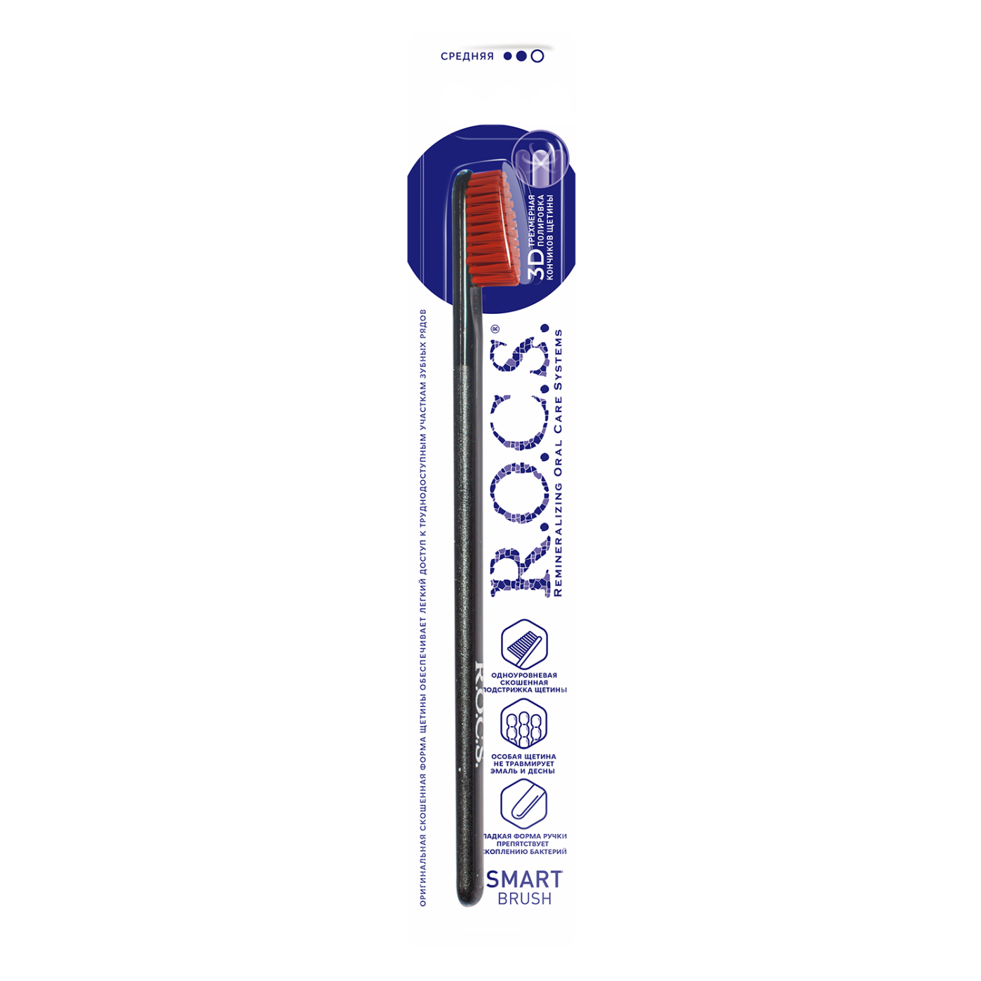 Зубная щетка R.O.C.S. Smart brush классическая средней жесткости обеспечивает эффективный гигиенический уход за полостью рта на каждый день. Текстурированная щетина, скошенная к концу головки щетки, повышает качество чистки поверхности зубов и позволяет с легкостью проникать в труднодоступные участки зубного ряда. Закругленные, отполированные на концах щетинки, не повреждают эмаль и зубные реставрации, не травмируют десны. Тонкая плоская ручка, выполненная из безопасного, нетоксичного пластика, снижает излишнее давление во время чистки и способствует правильной технике.