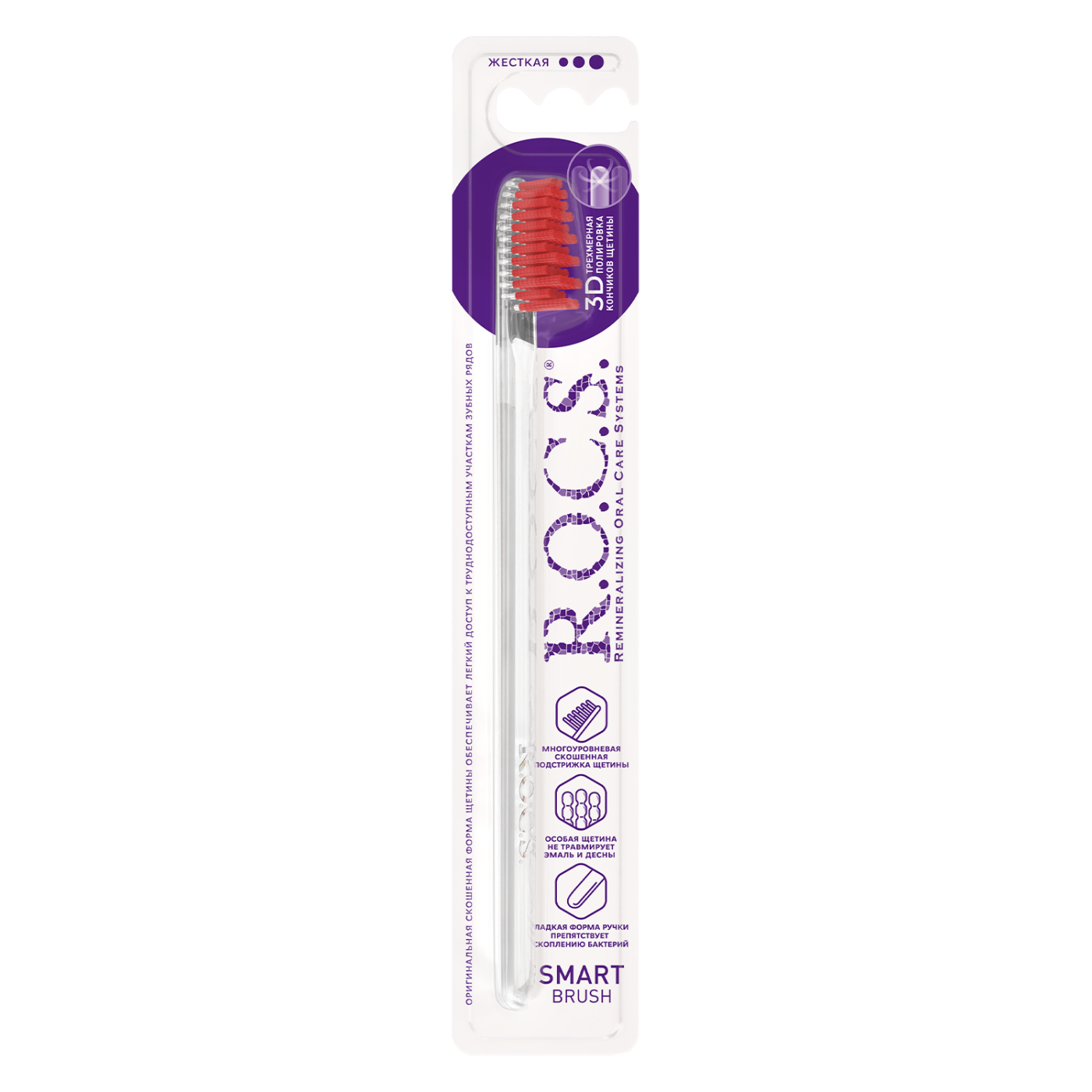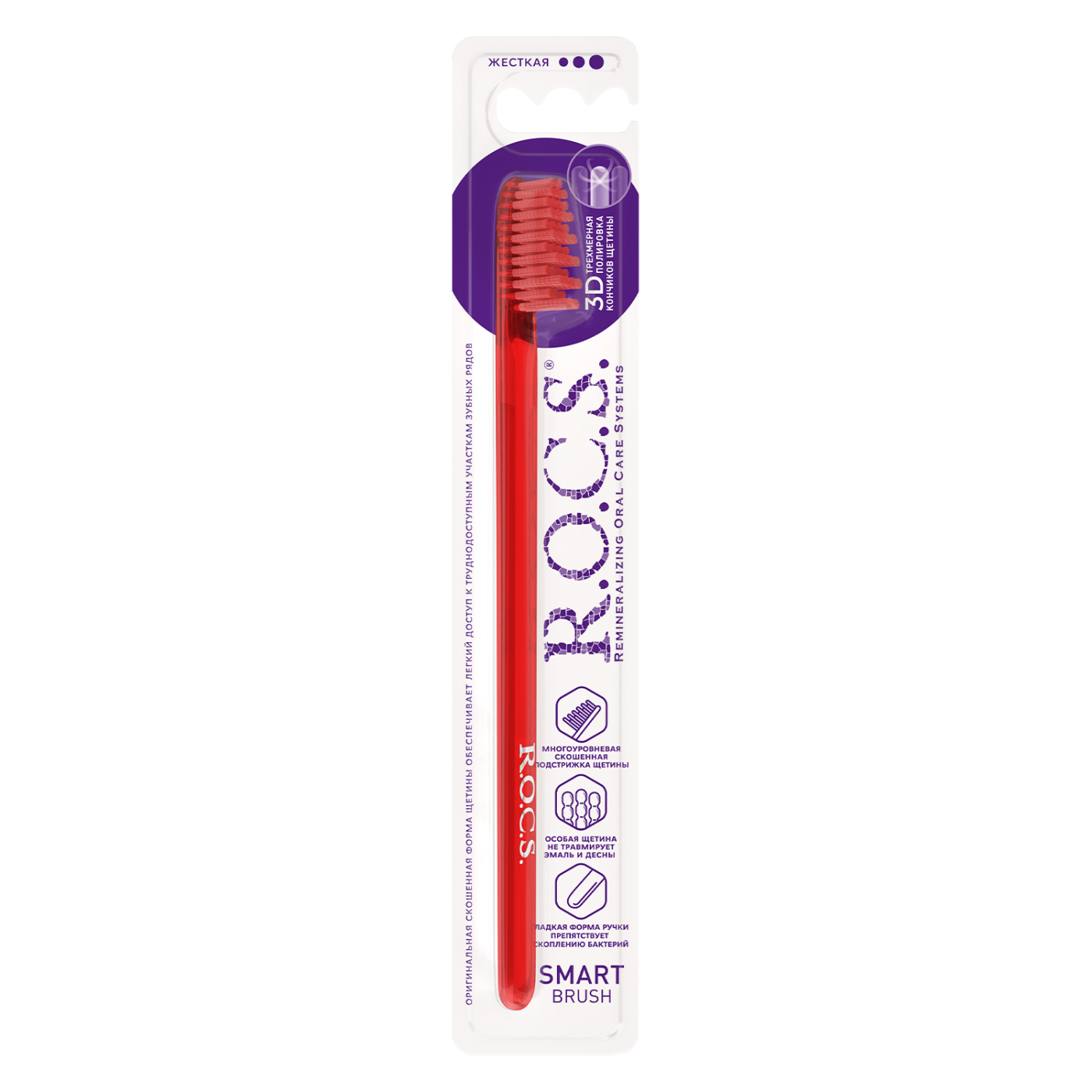 Зубная щетка R.O.C.S. Smart brush модельная с жесткой щетиной обеспечивает эффективный гигиенический уход за полостью рта при усиленном образовании зубного налета. Многоуровневая подстрижка щетины, скошенная к концу головки щетки, повышает качество чистки поверхности зубов и позволяет с легкостью проникать в труднодоступные участки зубного ряда. Закругленные, отполированные на концах щетинки, не повреждают эмаль и зубные реставрации, не травмируют десны. Тонкая плоская ручка, выполненная из безопасного, нетоксичного пластика, снижает излишнее давление во время чистки и способствует правильной технике.