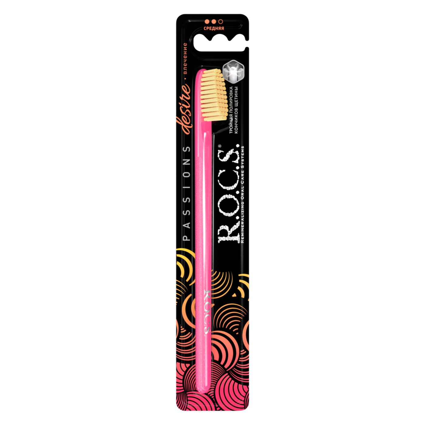 Зубная щетка R.O.C.S. PASSIONS средней жесткости — яркое и стильное решение для любой ванной комнаты! Она обеспечивает высокий комфорт при ежедневном уходе за полостью рта. Классическая одноуровневая скошенная подстрижка обеспечивает легкое проникновение к дальним зубам и качественную очистку всех поверхностей зубного ряда. Технология тройной полировки кончиков гарантирует бережный уход за деснами. Лёгкая и тонкая ручка помогает избежать излишнего давления во время чистки.