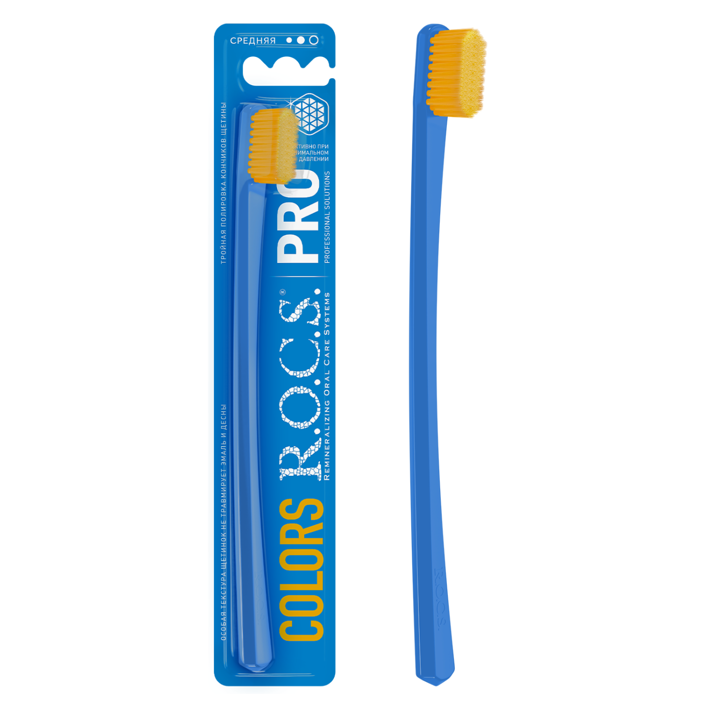 Зубная щетка R.O.C.S. PRO COLORS с щетиной средней жесткости качественно и бережно удаляет налет с поверхности зубов, не травмируя десна, эмаль и реставрации из пломбировочных материалов, благодаря закругленным и отполированным на концах щетинкам. Специально разработанная тонкая изогнутая ручка предотвращает излишнее давление на десны и обеспечивает удобство во время чистки зубов.