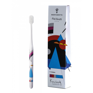 Высокотехнологичная щетина кисти для зубов Кандинский из коллекции Montcarotte ABC сделана из полиамида - он не впитывает влагу и сохраняет форму в два раза дольше полиэстера. Такая щетина поможет добиться максимально гладкой поверхности эмали и желаемой белизны. Идеально закругленные на конце волокна щетины не травмируют десна и бережно полируют поверхность эмали. Ручка щетки сделана из высокопрочного пластика, имеет форму художественной кисти, что также позволяет добиться максимально правильной техники чистки зубов. Художник показывает нам, что пространство простых форм может быть непростым и загадочным и являться бесконечностью для одного и границами реальности для иного.
