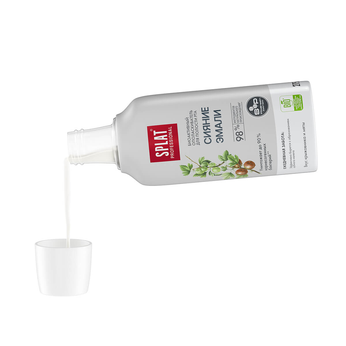 Инновационный ополаскиватель для полости рта SPLAT Professional «Сияние эмали» с системой SP. FitoBreath System эффективно очищает зубы и десны от налета и остатков пищи, предотвращает рост кариесогенных бактерий, поддерживает баланс pH и надолго сохраняет свежесть дыхания. Экстракт плодов крыжовника оказывает антиоксидантное и противовоспалительное действие, яблочная кислота способствует мягкому отбеливанию эмали и помогает бороться с пигментацией, а бисаболол усиливает антибактериальную защиту и заботится о здоровье десен.