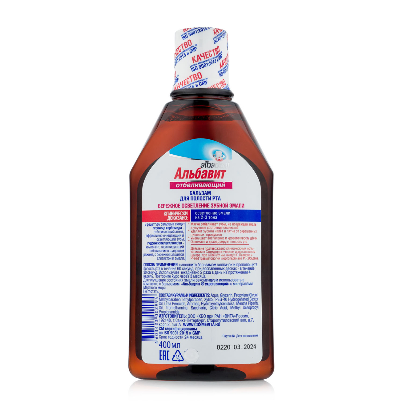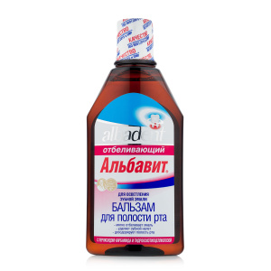 Отбеливающий бальзам-ополаскиватель для полости рта Альбавит - современное эффективное безопасное средство. Создает в полости рта обволакивающую среду, необходимую для щадящего отбеливания зубной эмали. Удаляет зубной налет и пятна, вызванные употреблением красящих пищевых продуктов, устраняет неприятный запах и дарит ощущение свежести.