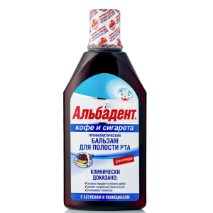 Лечебно-профилактический бальзам Альбадент кофе и сигарета защищает слизистую полости рта от воспаления и раздражения, вызванного табачным дымом и горячим кофе, удаляет налет, борется с неприятным запахом изо рта.