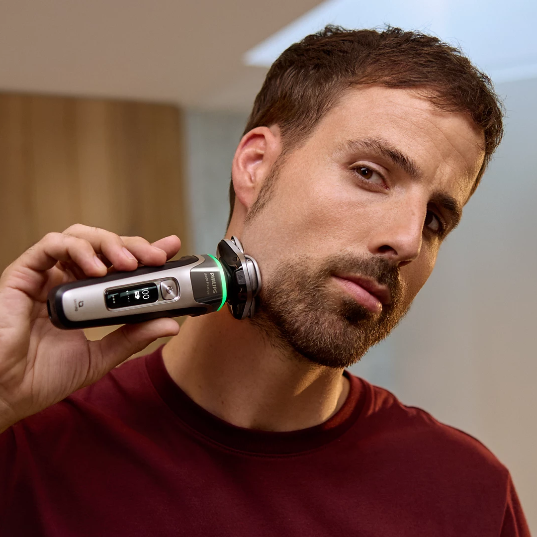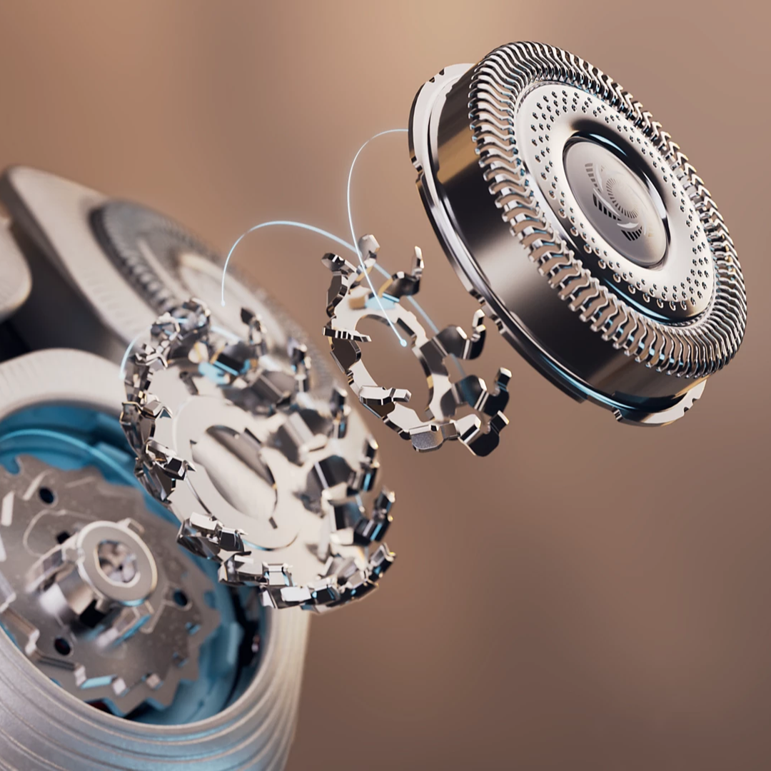 Запатентованная система Triple Action Lift & Cut бережно приподнимает волоски и срезает их точно у поверхности кожи — до 0,00 мм, не повреждая эпидермис. Компактные плавающие головки с 360° подвижностью повторяют каждую линию лица и шеи, обеспечивая плотный контакт и точность даже в труднодоступных зонах — под носом и на шее. Технология Dual SteelPrecision Blades выполняет до 7 миллионов режущих движений в минуту, эффективно справляясь с щетиной разной длины — от 1 до 7 дней.