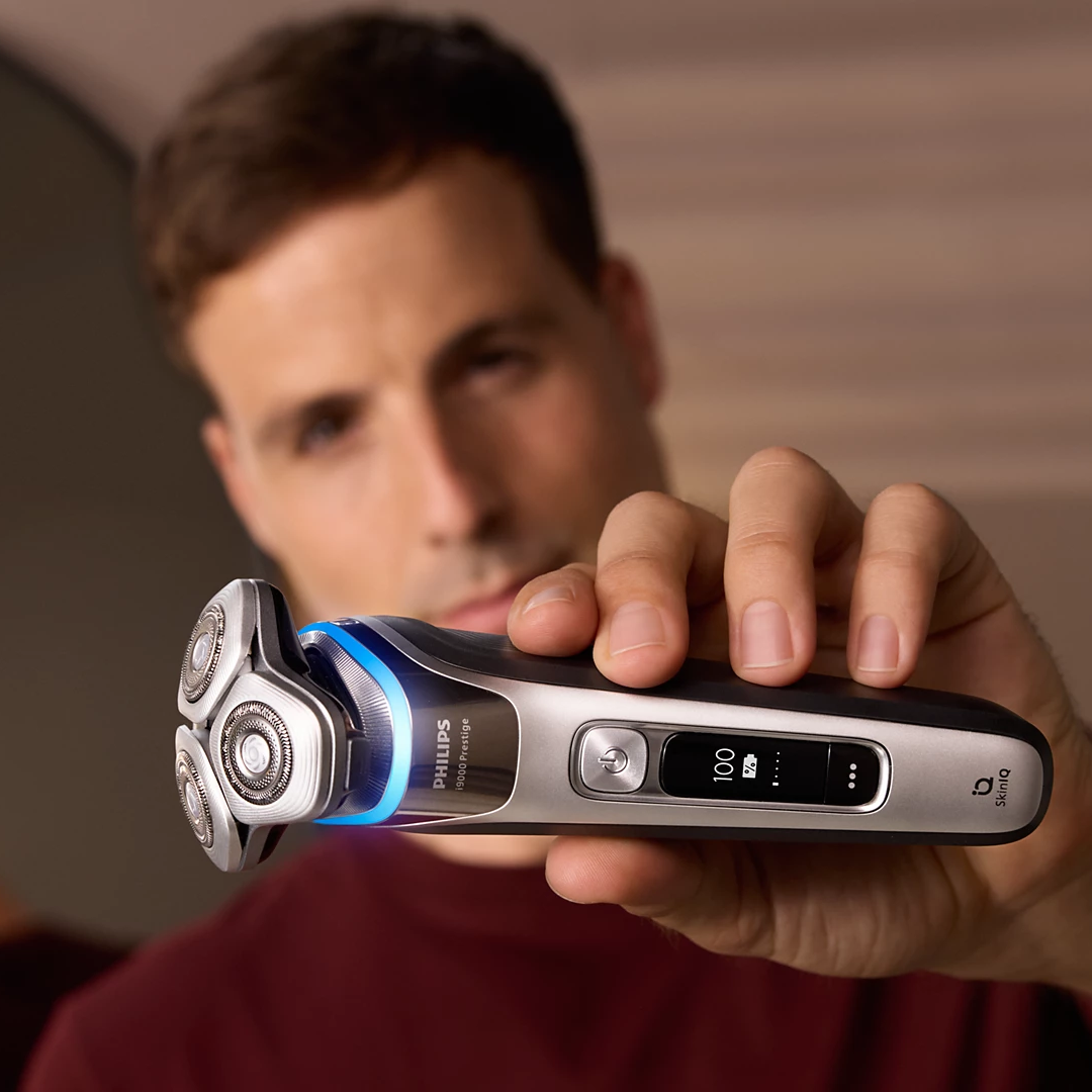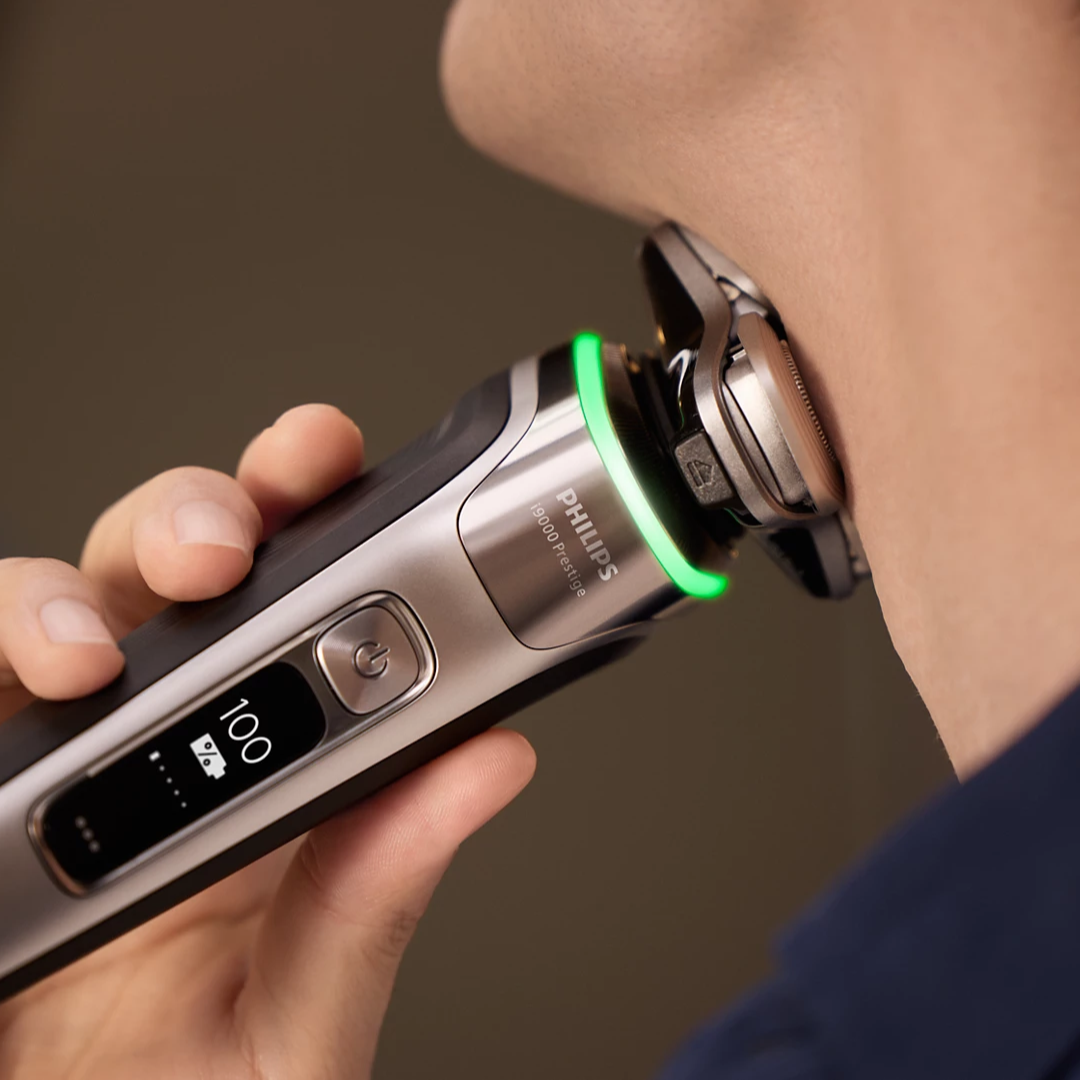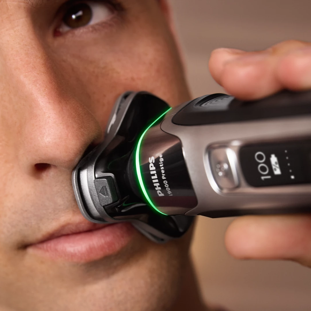 Philips i9000 полностью водонепроницаема — можно использовать с гелем, пеной или прямо в душе. Очистка — одним касанием: просто откройте головку бритвы и промойте под водой.