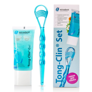 Набор Miradent Tong Clin Set помогает бережно очистить поверхность языка, удалить налет и сократить количество бактерий, снижая риск развития кариеса и пародонтита, а также устранить неприятный запах изо рта. Набор включает гель Tong-Clin и щетку Tong-Clin De Luxe.