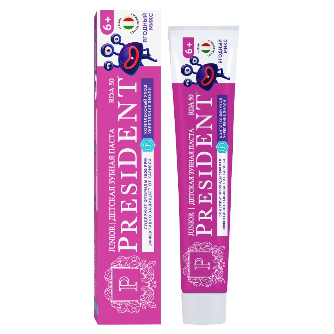 Детская зубная паста PRESIDENT Ягодный микс (6+) обеспечивает защиту от кариеса, укрепляет эмаль и поддерживает здоровье дёсен. Разработана с учётом особенностей ухода за зубами у детей старше 6 лет. Приятный ягодный вкус мотивирует регулярно чистить зубы.