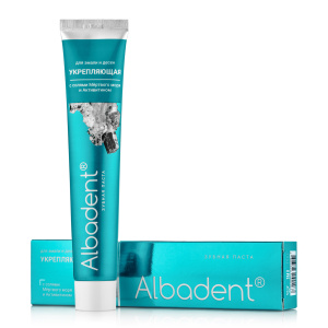 Зубная паста Альбадент Укрепляющая с минералами Мертвого моря реминерализирует и укрепляет зубную эмаль. Активин (двухфазный экстракт шалфея, ромашки, зверобоя и календулы) способствует обновлению слизистой, поддерживает тонус тканей, устраняет отечность, уменьшает воспаление и кровоточивость. Эфирное масло мяты дарит ощущение свежести. Пирофосфат натрия и калия эффективно удаляют налет и усиливают защиту от кариеса.