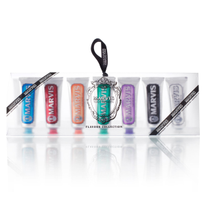 В состав набора входят 7 паст с разными вкусами: Классическая Насыщенная Мята / CLASSIC STRONG MINT 25 мл; Зубная паста отбеливающая Мята / WHITENING MINT 25 мл; Зубная паста Мята и Корица / CINNAMON MINT 25 мл; Зубная паста Мята и Имбирь / GINGER MINT 25 мл; Зубная паста Мята и Жасмин / JASMIN MINT 25 мл; Зубная паста Лакрица Амарелли / AMARELLI LICORICE 25 мл; Зубная паста Свежая Мята / AQUATIC MINT 25 мл.